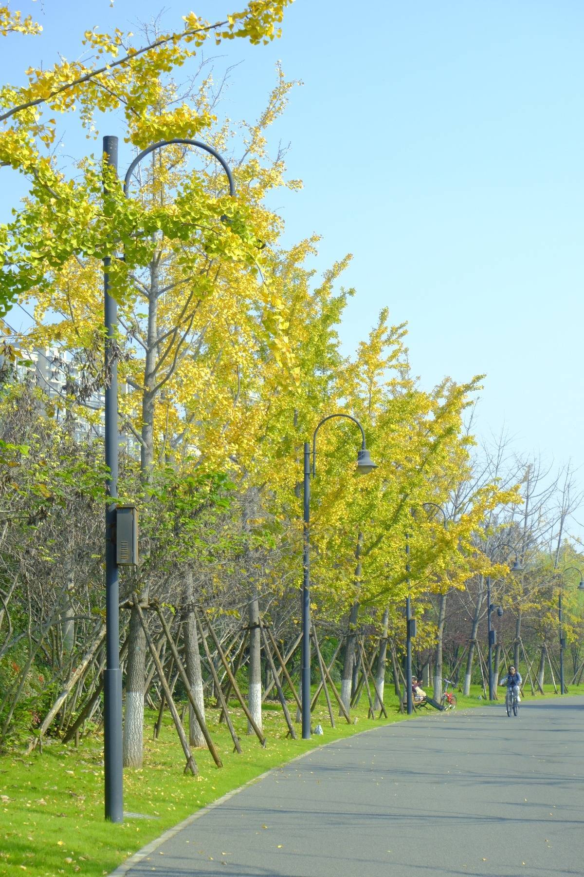 从无人机俯瞰,这条由银杏树构成的行道树带整体呈独特的“宝塔”状,与周边的园林景观及湖光山色相互映衬,风景格外优美。