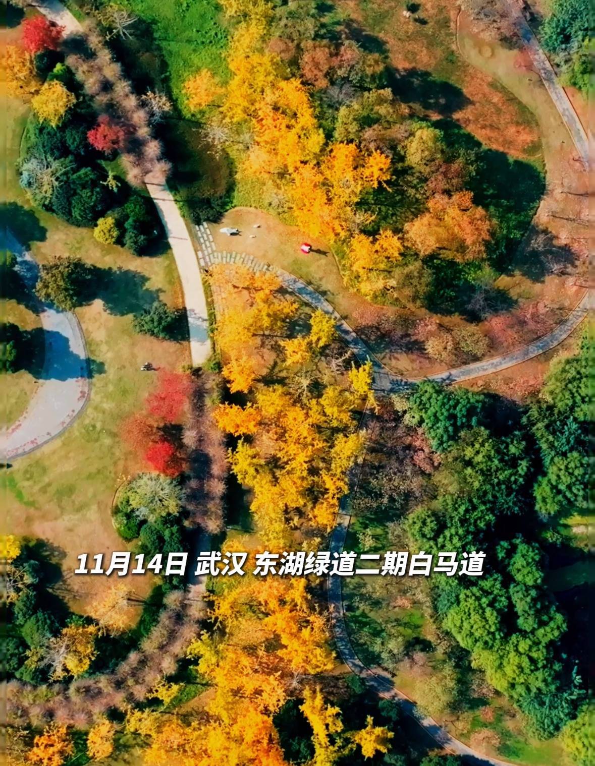 11月14日上午,九派新闻记者在武汉东湖白马道看到,一段约1公里长的道路两侧,银杏树正披着满树金黄,地面也仿佛铺上了一层金色的地毯,在暖阳映照下格外绚烂。
