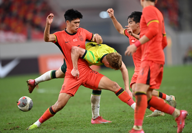 2025年9月9日,中国队球员彭啸(左一)在比赛中防守。\n 当日,在陕西西安举行的2026亚足联U23亚洲杯预选赛D组第三轮比赛中,中国队0比0战平澳大利亚队,作为成绩最好的4个小组第二晋级明年在沙特举行的U23亚洲杯正赛。\n 新华社记者 李一博 摄