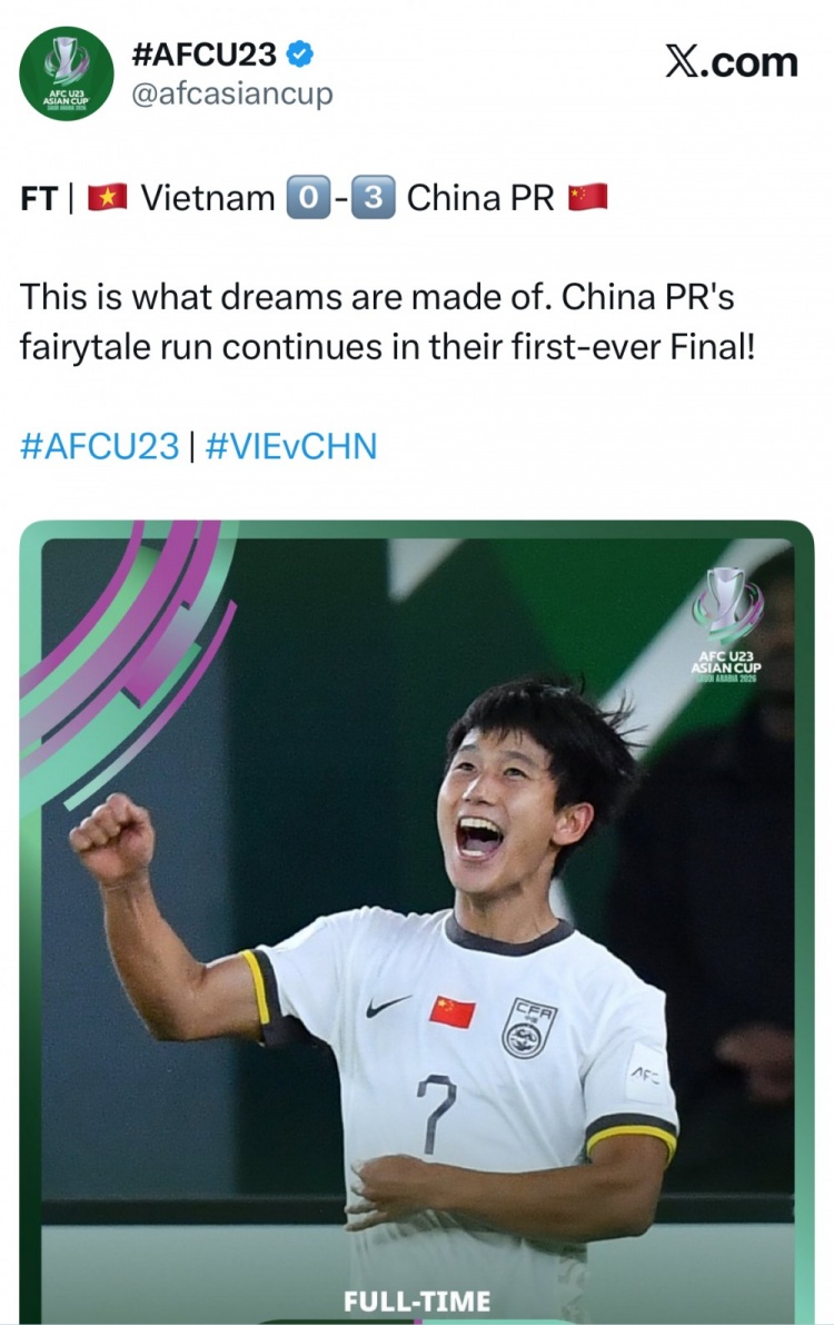 U23亚洲杯官方社交媒体报道:这就是梦想的构成要素,中国队童话仍在继续。