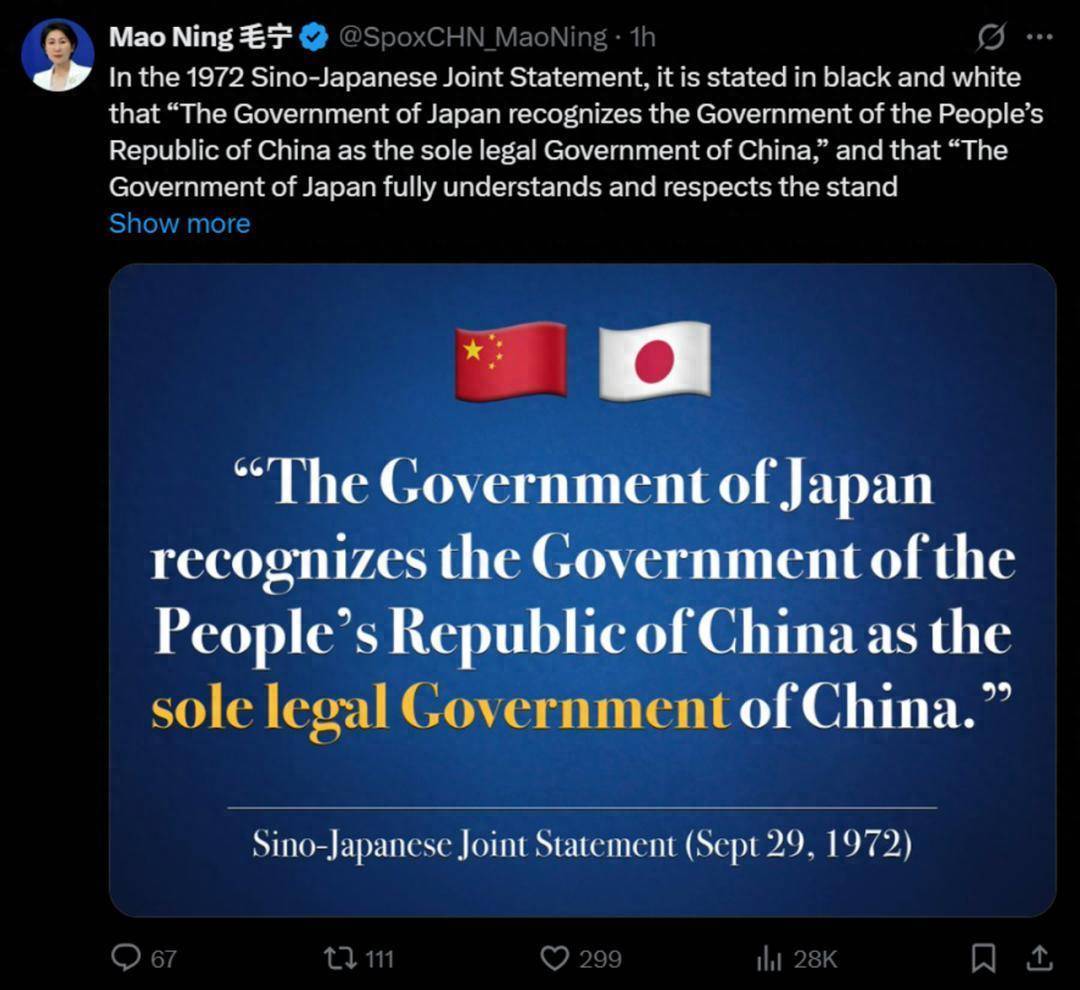 毛宁先后用英日双语发帖称,“1972年的《中日联合声明》里白纸黑字写着,‘日本国政府承认中华人民共和国政府是中国的唯一合法政府’,以及‘日本国政府充分理解和尊重中国政府关于台湾是中华人民共和国领土不可分割的一部分的立场。’无论谁当政,日本都必须信守承诺。”